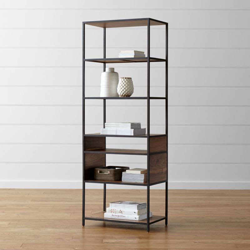 Shelves in walnut veneer with matt finish and contemporary style open bookcase, with hand turned lances made of solid maple wood structure. Holds books, catalogs and binders. Shop bookshelves & bookcases at target.